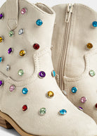 More color. More sparkle. More fun. The WHOOPI MINI in Grey Suede brings the party with every step thanks to a full rainbow of gemstone studs that pop against the soft neutral faux suede. With a low stacked heel and easy pull-on design, this mini western boot is made for little ones who like their looks with extra personality. The kind of boot that turns every sidewalk into a runway.